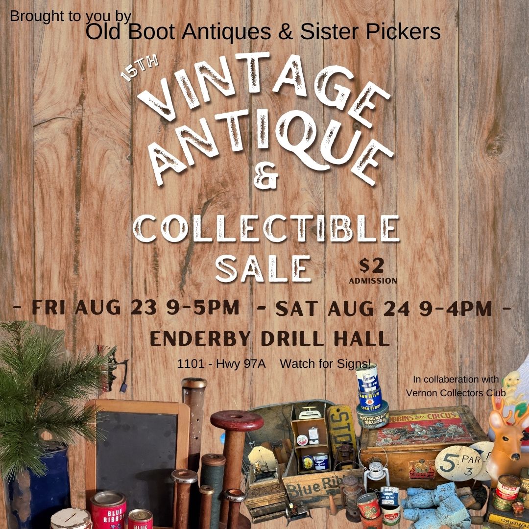 Join Old Boot Antiques & Vintage and Sister Pickers as they continue the 15th Annual Enderby Antique Sale as Larry steps down after 14 years. There will be over 40 tables of vintage, antique, collectibles, records, vintage clothing, toys, tools, farm, rustic, primitive and so much more! $2 admission for both days. Fri, Aug 23 […]