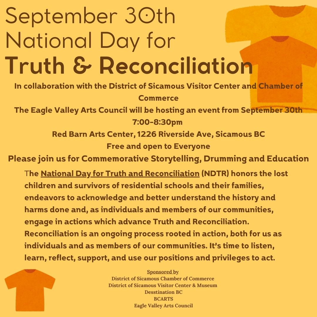 The Eagle Valley Arts Council in collaboration with the District of Sicamous Visitor Center and Chamber of Commerce, will be hosting a Commemorative Event September 30th from 7:00-8:30pm Red Barn Arts Center, 1226 Riverside Ave, Sicamous BC Free and open to Everyone Please join us for Commemorative Storytelling, Drumming and Education ?