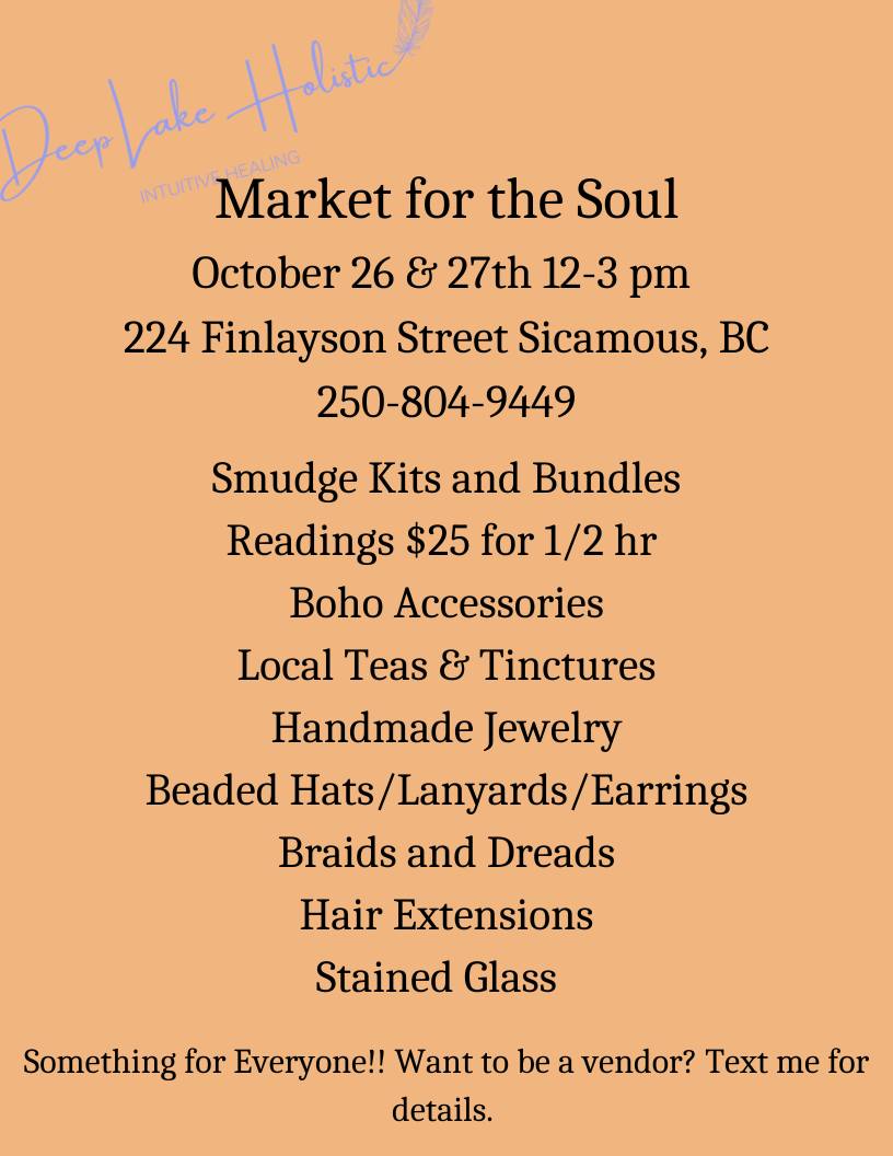 This market has esoteric, stained glass, crystal balls, spirit boards, tarot card readings, and many handmade items at Deep Lake Holistic, 224 Finlayson Street in Sicamous B.C On Saturday October 26 and Sunday October 27 from 12:PM to 3:PM both days. (It is at Deep Lake Holistic next to the mini golf across from Blondies) […] |