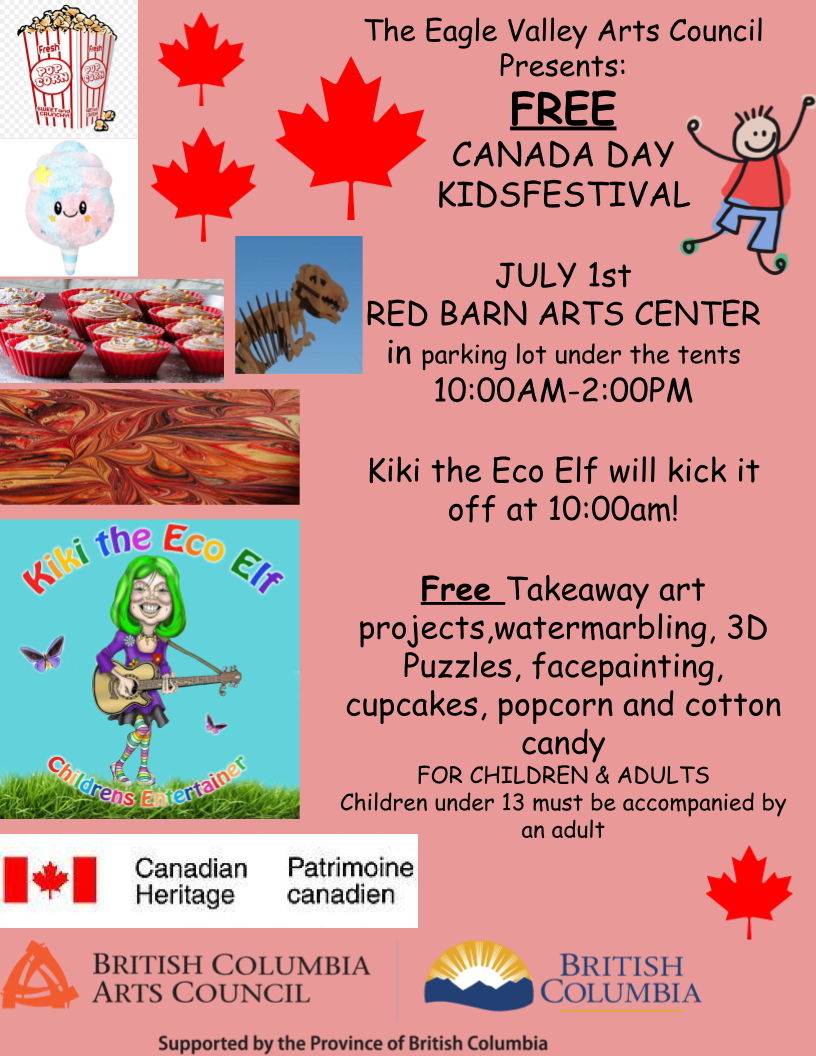FreeEagle Valley Arts Council presents: Canada Day FREE Kids Festival ! July 1st – 10:00am – 2:00pm Celebrate Canada Day with a FREE Kids’ Festival at the Redbarn Arts Center in Sicamous on July 1st! The festivities kick off at 10:00am and run until 2:00pm. Catch Kiki The Eco Elf as she opens the event and roams around from 10:00 to 11:30.