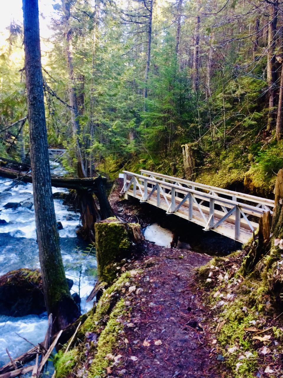 The Upper Flume Trail runs through a vibrant and lush old-growth forest and follows the creek. This is where you really see the history as there is a replica flume, original remnants, and a beautiful timber stair set, and there are seven unique and newly constructed bridges! There is also the impressive Bear Creek Falls, seen from a viewpoint high above!